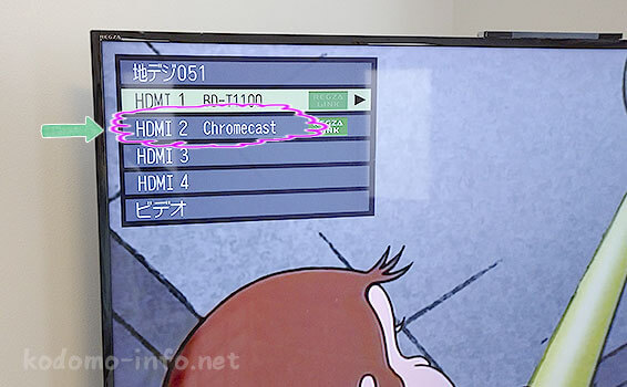 先ほどクロームキャストを接続したHDMIに、「Chromecast」と表示されています。私は端子2に接続したので、HDMI 2に「Chromecast」と表示されていますね。