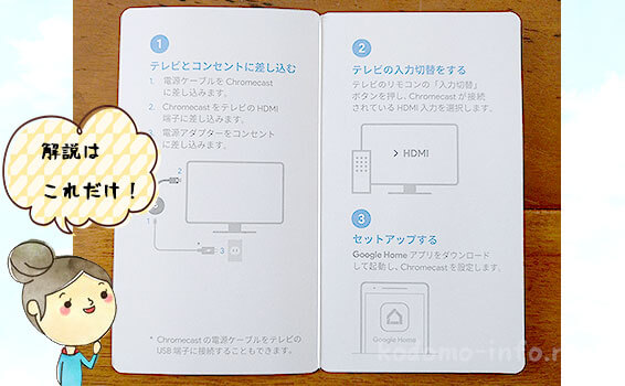 クロームキャストには一応説明書が入っていますが、解説はほとんどありません。ペラっと開いてこれだけです。